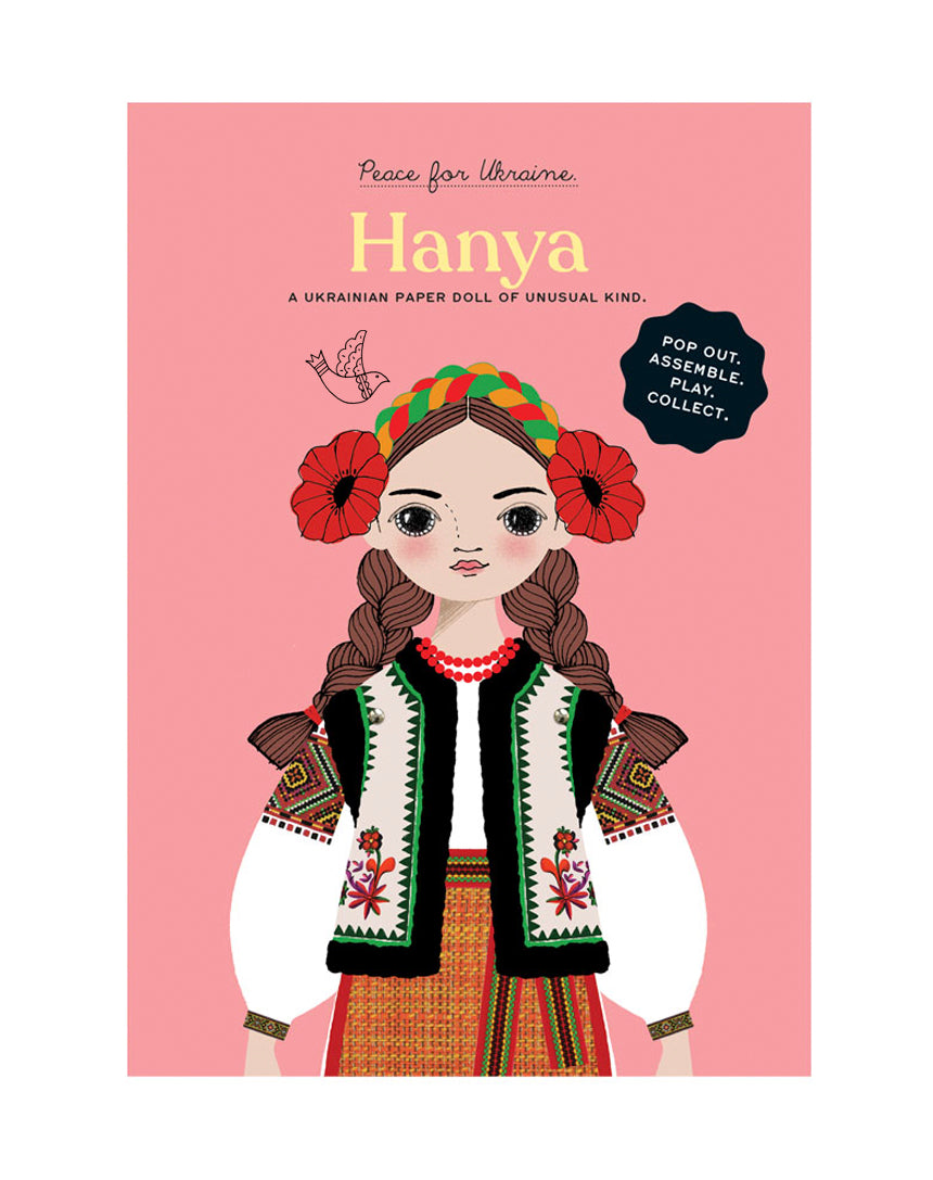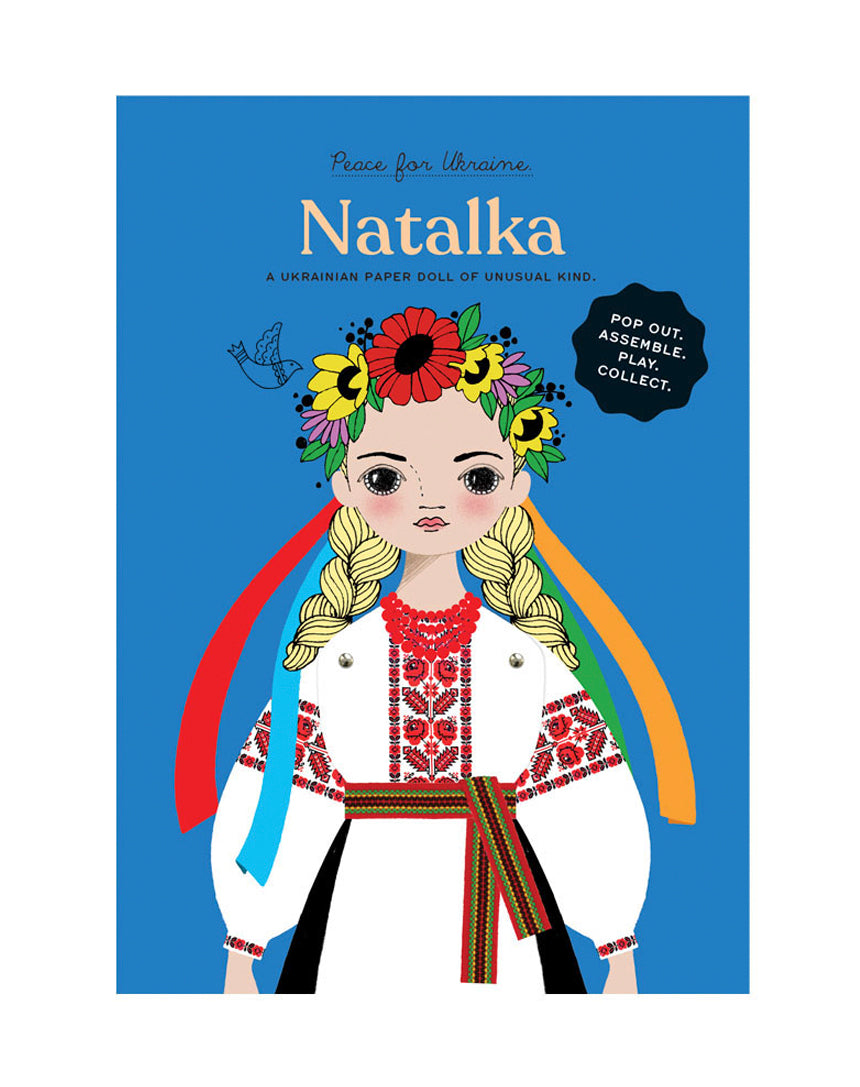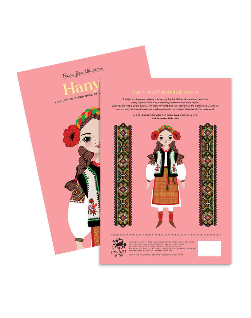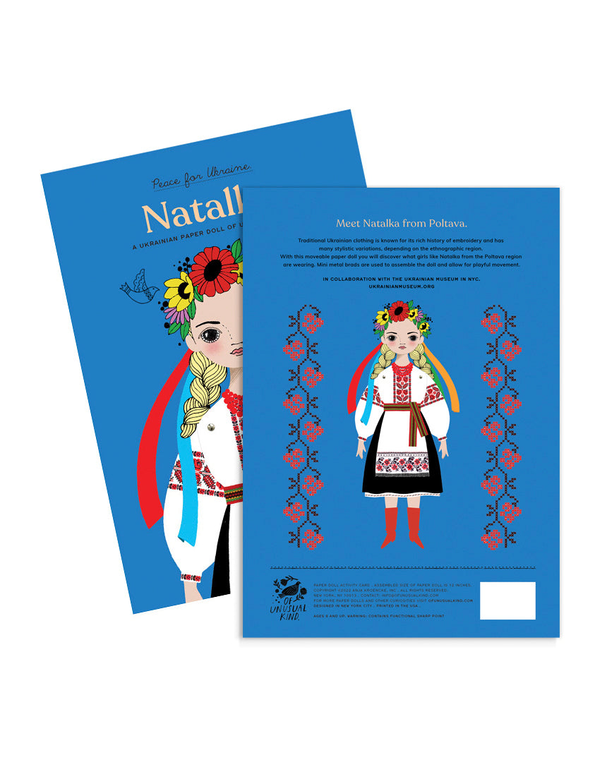 We created our “Peace for Ukraine” Collection in collaboration with the Ukrainian Museum in NYC. These paper doll accordion cards measure 6”x 8.5” and unfold to reveal 4 panels. Pop out the paper doll parts. Assemble the doll with the enclosed assembly instructions and mini metal brads. Learn about the traditional Ukrainian outfits Natalka and Hanya are wearing. Approx size of assembled doll 12” tall. Ages 8 and up. Made in the USA. Packed in a clear cello sleeve.